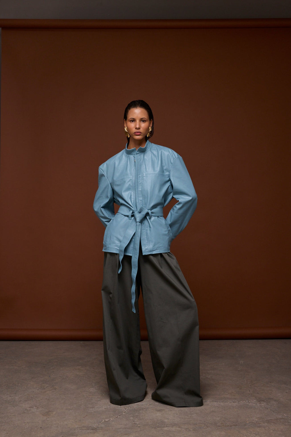 This striking blue leather jacket combines luxurious materials with sophisticated design for a statement outerwear piece. Crafted from premium cow leather, it features artisanal techniques that highlight both structure and exceptional quality. Versatile in styling, pair with our pants for a refined office look or with our shirts for special occasions.
